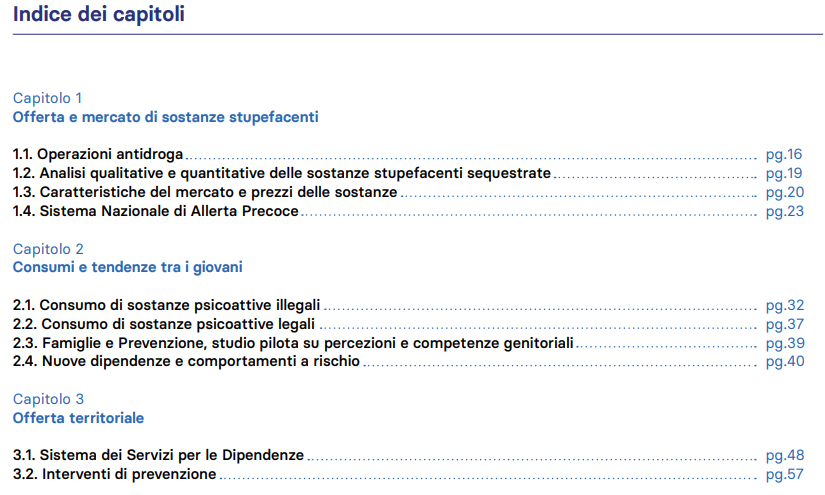 Lo scenario della diffusione e del consumo di sostanze stupefacenti e psicotrope in Italia è caratterizzato, nel 2023 (anno di riferimento della maggior parte dei dati contenuti nella Relazione), da trend in aumento: in rapporto sia ai consumi, sia ai reati penali in violazione del “Testo Unico delle leggi in materia di disciplina degli stupefacenti e sostanze psicotrope, prevenzione, cura e riabilitazione dei relativi stati di tossicodipendenza”, sia alla domanda di trattamento.