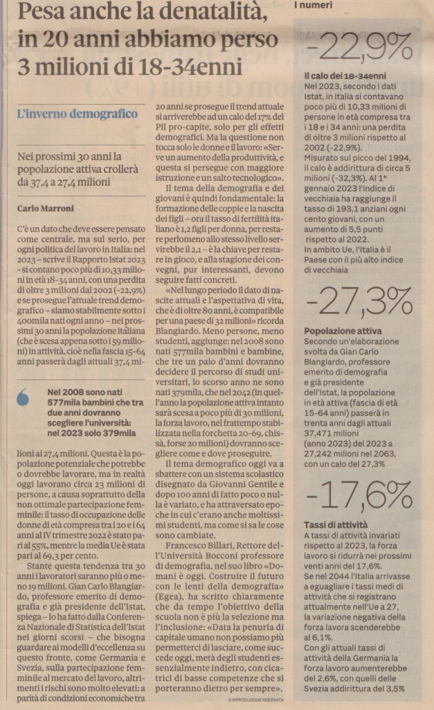 Denatalità: in 20 anni abbiamo perso 3 milioni di 18-34enni, in Il Sole 24 Ore, 7 luglio 2024