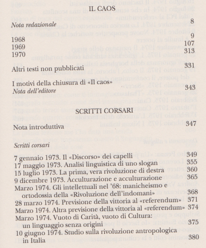 Nel serrato dialogo con i lettori tra il1968 e il 1970 la rubrica Il caos, sul settimanale «Tempo», affronta l’attualità politica e le novità culturali di quegli anni, la cronaca pubblica e la vita privata.