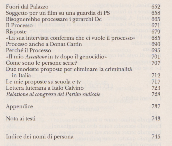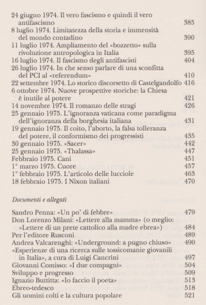 Si arriva così alle ultime pagine scritte nel 1975, l’anno della scomparsa, con la violenta requisitoria delle Lettere luterane contro un’Italia vittima di una generalizzata «ansia di conformismo» e di un inarrestabile degrado che sembra non dare ancora oggi segni di rallentamento.