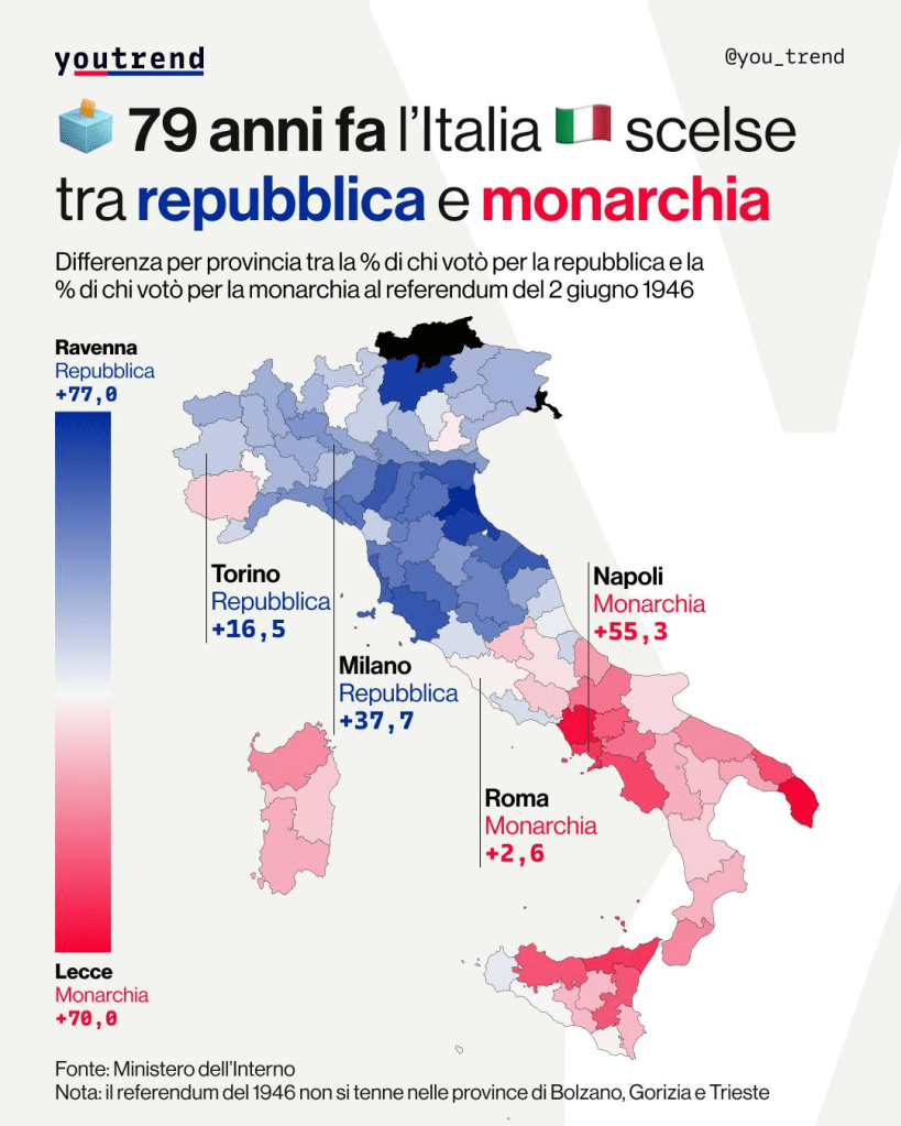79 anni fa l’Italia scelse fra Repubblica e monarchia, mappa dei risultati elettorali a cura di Youtrend