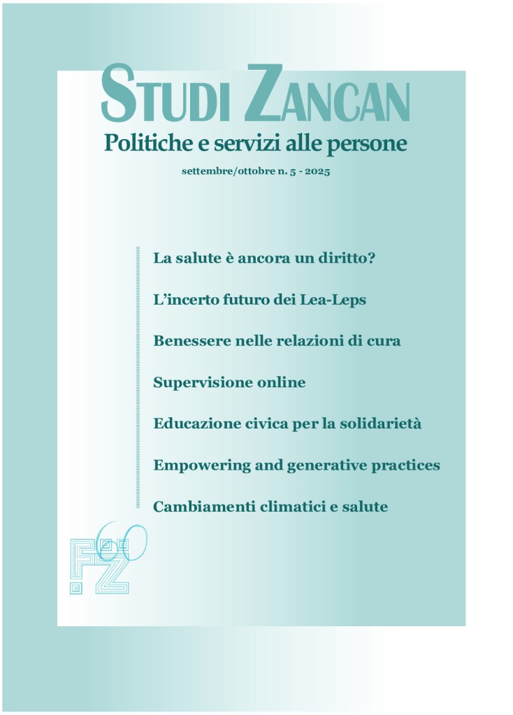 - Studi Zancan 5/2025 affronta il tema della salute, esaminando il futuro dei Lea-Leps, e quello del potenziale del coaching per i caregiver familiari. Approfondisce anche riflessioni, criticità e prospettive della supervisione online nel servizio sociale e il tema del recente inserimento dell’educazione civica nel sistema di istruzione. La sezione internazionale “iaOBERfcs insights” tratta le differenze tra empowering e pratiche generative. Il numero della rivista chiude con una rubrica a cura di Giovanni Saonara su cambiamenti climatici e salute.