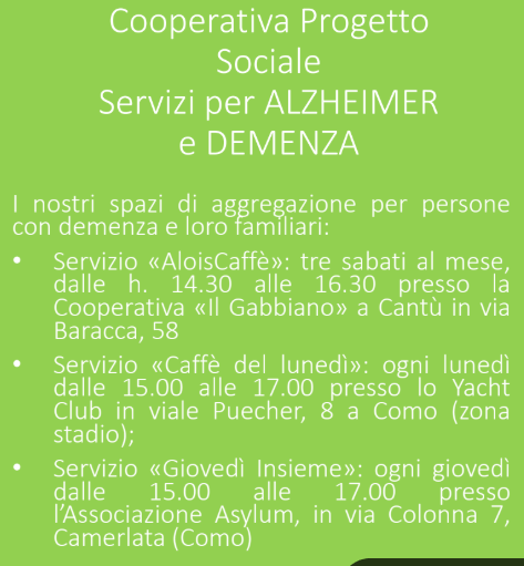 - Servizio AloisCaffè – Cantù; sabato 10, 17 e 31 gennaio dalle h. 14.30 alle h. 16.30 presso il salone al piano terra della Cooperativa il Gabbiano, via Baracca, 58;
