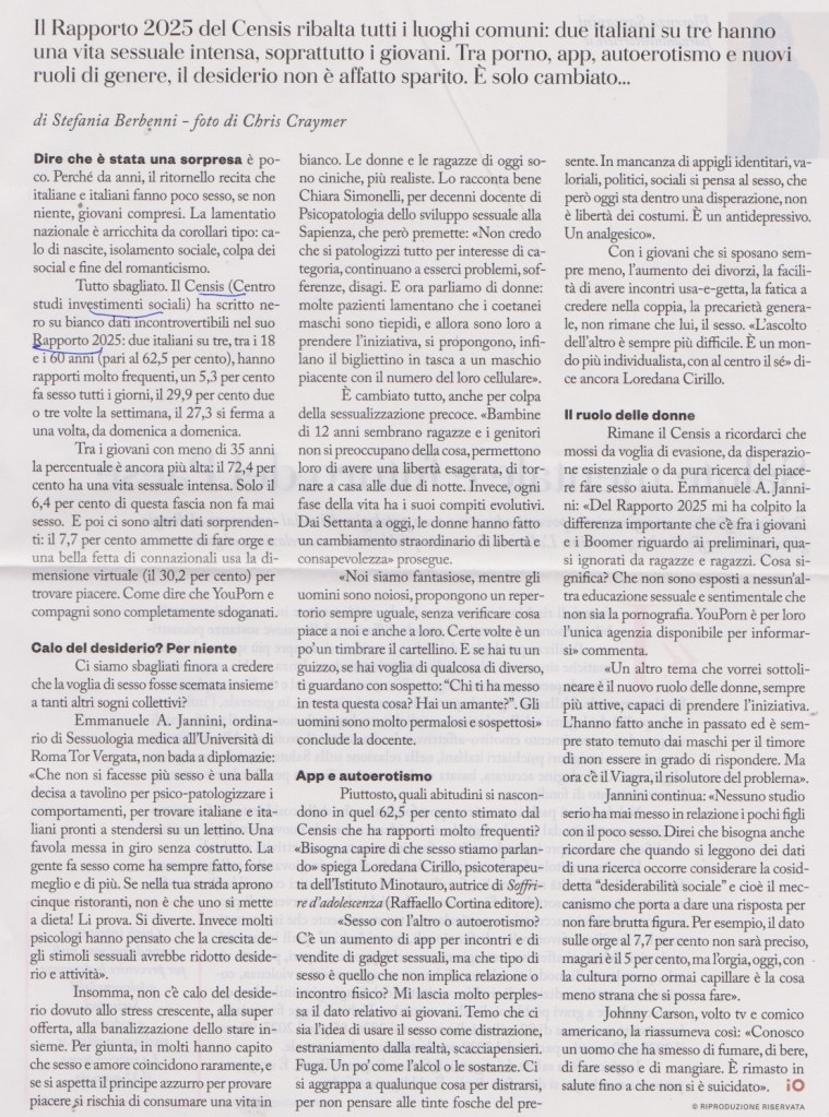 Il 59° Rapporto Censis sulla situazione sociale del Paese/2025 dedica un focus alla sessualità degli italiani, evidenziando una vitalità intensa e variegata, con il 62,5% degli intervistati tra 18 e 60 anni che dichiara una vita sessuale frequente.[alessandragraziottin]