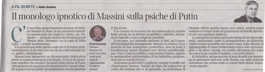 “Io, Vladimir – Stefano Massini racconta Putin” in onda in prima serata su NOVE , mercoledì 11 marzo 2026. [1, 2]
